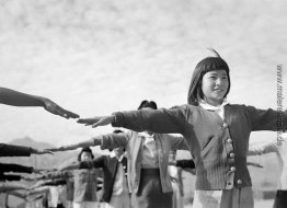 Weiblich Praktikanten üben Gymnastik bei Manzanar Internierungsl
