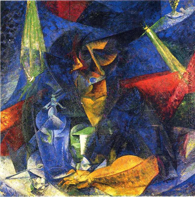 100% Handgemalte Produktion von Frau in einem Café: Compenetrations of Lights und Flugzeuge' von Umberto Boccioni auf Leinwand, Kunstreproduktion in Museumsqualität.
