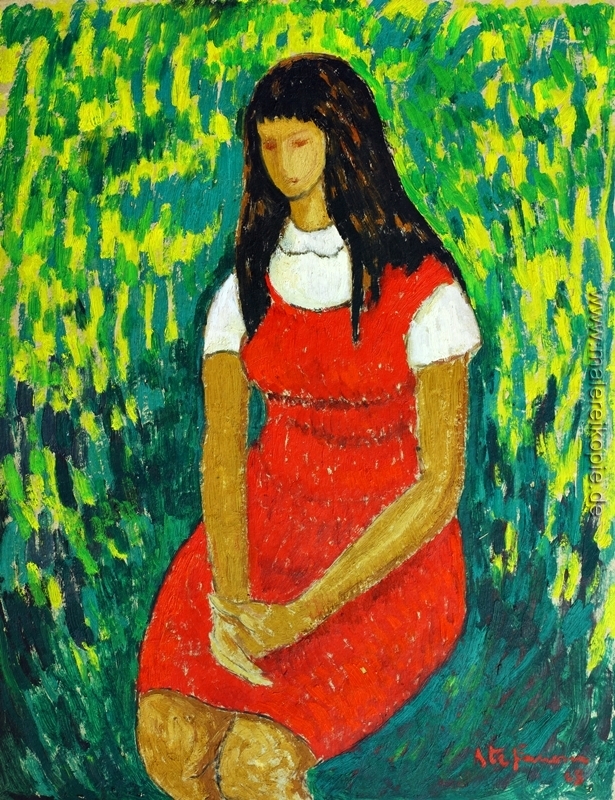 100% Handgemalte Produktion von Mädchen im Rot' von George Stefanescu-Ramnic auf Leinwand, Kunstreproduktion in Museumsqualität.