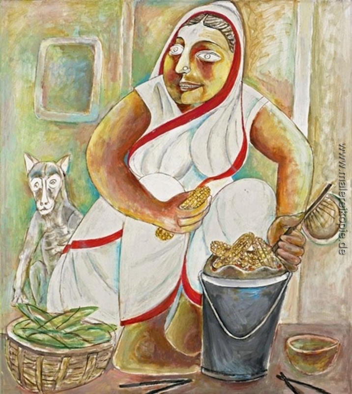 100% Handgemalte Produktion von Woman Verkauf von Mais' von Paritosh Sen auf Leinwand, Kunstreproduktion in Museumsqualität.