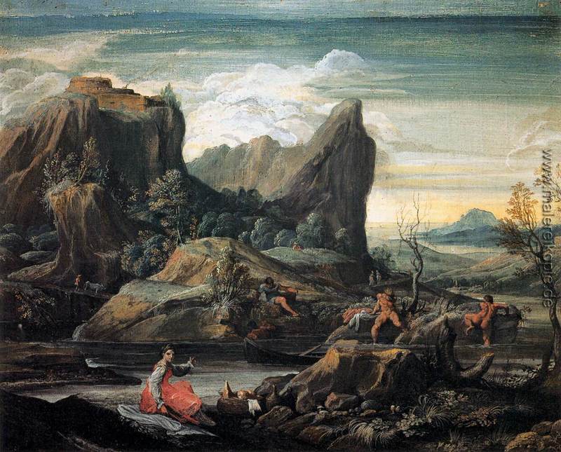 100% Handgemalte Produktion von Landschaft mit Badenden' von Agostino Carracci auf Leinwand, Kunstreproduktion in Museumsqualität.