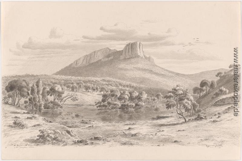 100% Handgemalte Produktion von Mt. Sturgeon und die Wannon im Grampians, Victoria' von Eugene von Guerard auf Leinwand, Kunstreproduktion in Museumsqualität.
