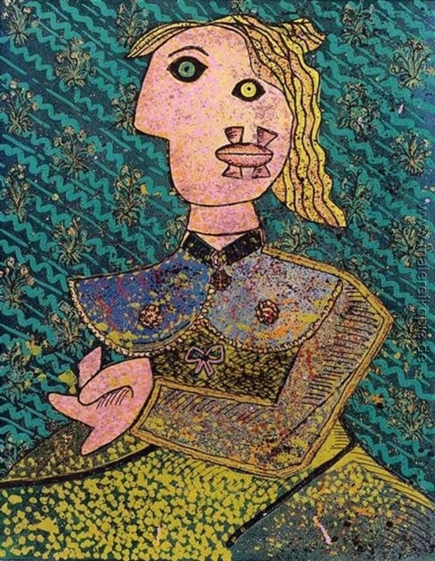 100% Handgemalte Produktion von Hommage à Picasso' von Enrico Baj auf Leinwand, Kunstreproduktion in Museumsqualität.