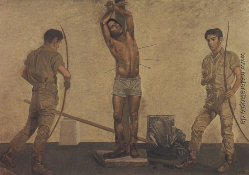 100% Handgemalte Produktion von St. Sebastian' von Yiannis Tsaroychis auf Leinwand, Kunstreproduktion in Museumsqualität.
