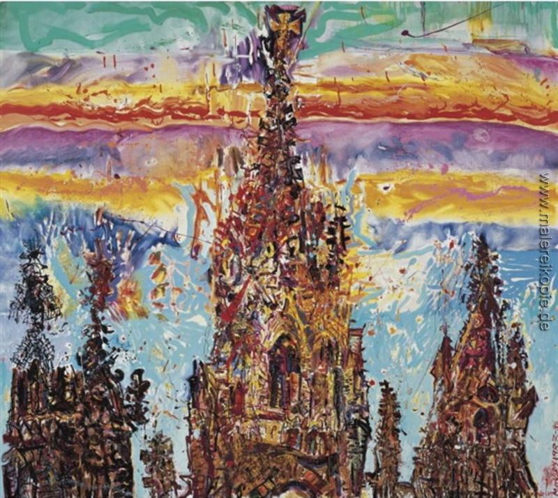 100% Handgemalte Produktion von Kathedrale von Barcelona als Blut-Rot Orange' von Malcolm Morley auf Leinwand, Kunstreproduktion in Museumsqualität.