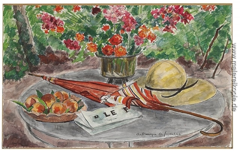 100% Handgemalte Produktion von Vase de fleurs, assiette de peches, ombrelle et le Figaro' von Andre Dunoyer de Segonzac auf Leinwand, Kunstreproduktion in Museumsqualität.
