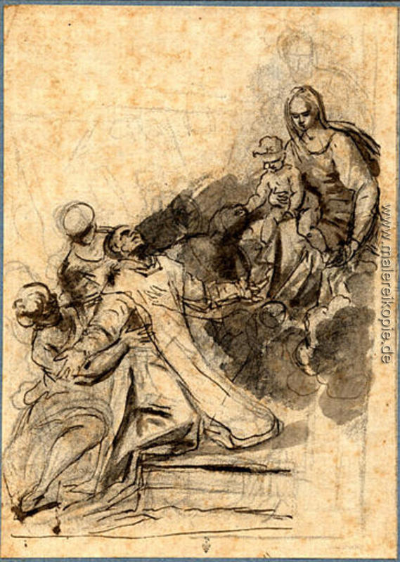 Ein Heiliger kniend und von Engeln unterstützt, in Ekstase vor d